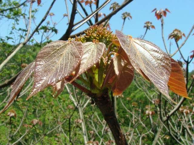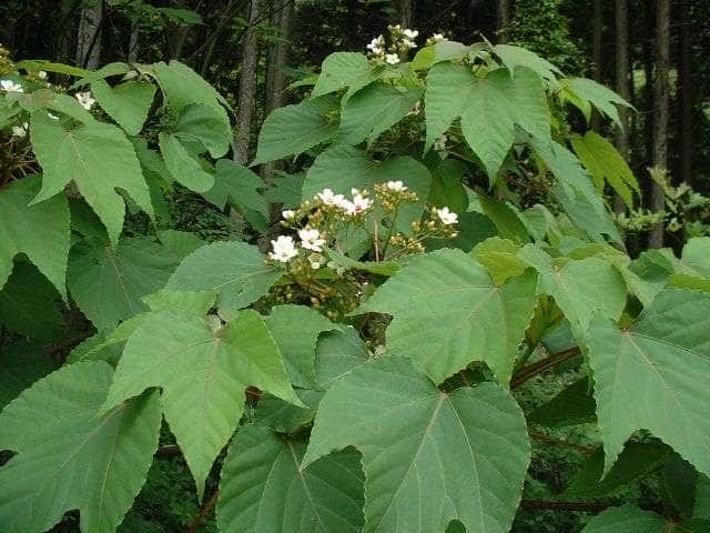 | 落葉高木 中部地方以西〜九州、日本に野生しているものは本来の自生かどうか不明。高さ15m、直径60cmほどになる。樹皮は淡灰褐色で、平滑、縦に浅いしわがある。枝は太くて無毛。はじめ緑色でのちに暗褐色。葉は互生。葉身は長さ15〜20cm、幅8〜16cmの卵形〜広卵形。先はとがり、基部はハート形。浅く3裂するものが多く、縁は鈍い鋸歯がある。裏面の脈腋に褐色の毛がある以外は両面とも無毛。葉身の表面基部に柄のある腺が2個ある。葉柄は紅色を帯び、長さ6〜12cm。雌雄同株。枝先に円錐花序をだし、直径2cmほどの白い花をつける。開花後しばらくすると花弁の基部や花糸は紅色を帯びる。果実は堅果。直径約2〜2.5cmの扁球形で溝が3個ある。10〜11月に熟すが、熟しても裂開しない。なかには種子が3個入っている、種子は直径約1cmの球形。花期は5〜6月 冬芽は、頂芽だけが発達する。頂芽は半球形で長さ7〜12mm。芽鱗は7〜12個。葉痕は円形で大きく、左右に托葉痕がある。(樹に咲く花) 学名は、Vernicia cordata 似た花にオオアブラギリがあり、果実の先端が尖る。 トウダイグサ科アブラギリ属 |