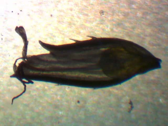 | ▼花序が3個ある。 | ▼小穂は長さ約2.7mm、中に果実が見える。 | ▼果実は上から2番目の鱗片の中にある。 |