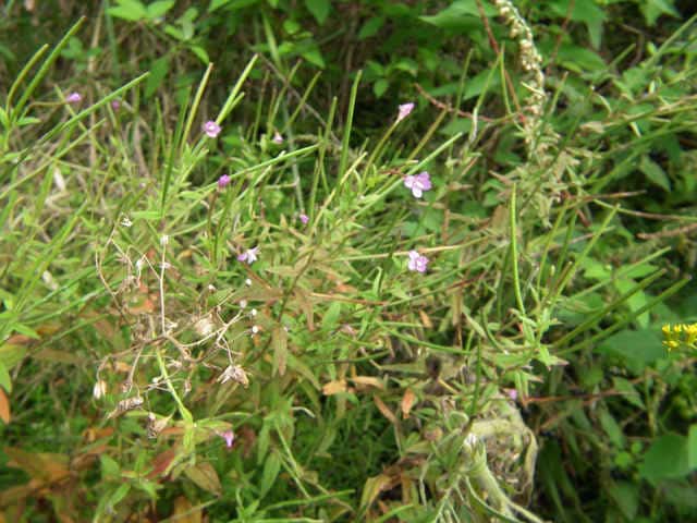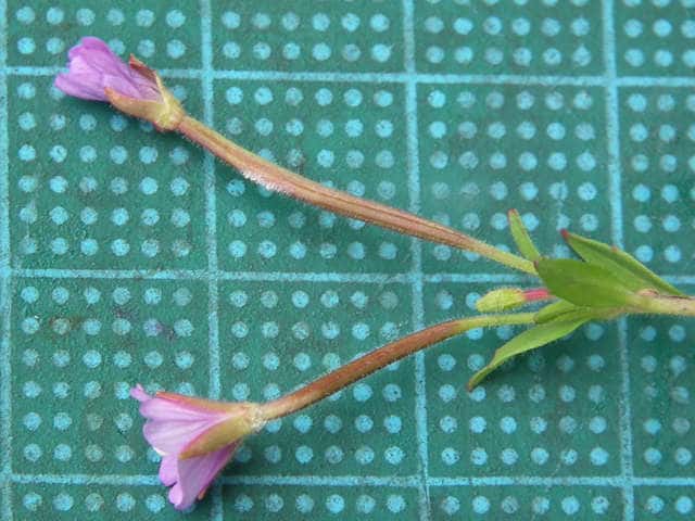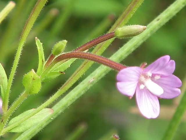 | 多年草 北海道〜九州の山野の水湿地に生える多年草で根元から地表をはう細長い匐枝を伸ばし、円形の葉を対生する。茎は高さ15〜90cmになり、稜線はなく、短い腺毛があって、上部で多くの枝を分ける。葉は無柄か短い柄があり、卵形〜卵状披針形、縁に鋸歯があり、先は鈍形かやや鋭形、基部は広いくさび形〜やや心形で、しばしば茎を抱き、長さ2〜6cm、幅0.7〜3cm、茎とともに赤みをおびることもある。萼裂片は披針形で長さ4〜7mm、外面に腺毛を密につける。花弁は倒卵形で、長さ6〜8mm、先は2浅裂し、紅紫色。さく果は長さ3〜8cmで、短い腺毛があり、果柄は長さ7〜15mm。種子は長楕円形、長さ1.5〜1.8mmで、細かい乳頭状突起を密生し、種髪はふつう赤褐色。花期は7〜9月。(日本の野生植物) 学名は、Epilobium pyrricholophum アカバナ科アカバナ属 |