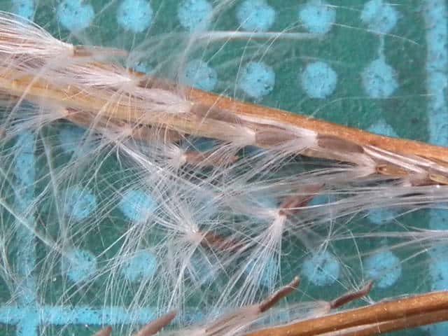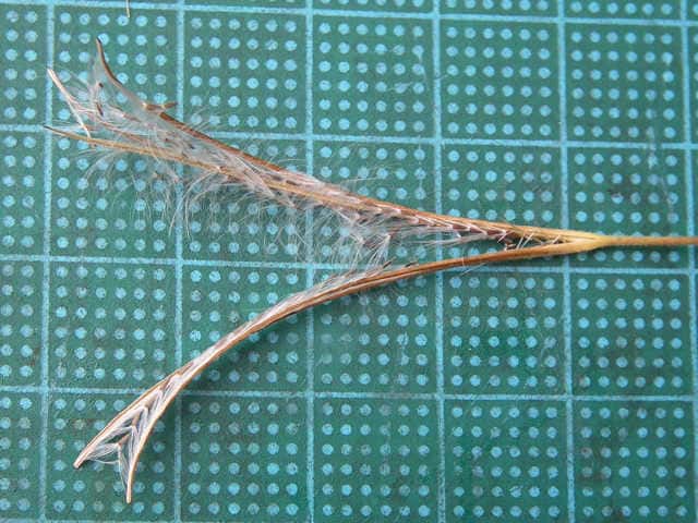 | ▼果実は長さ約5cm。 | ▼種髪をつけた種子、種髪は長さ約8mm。 | |