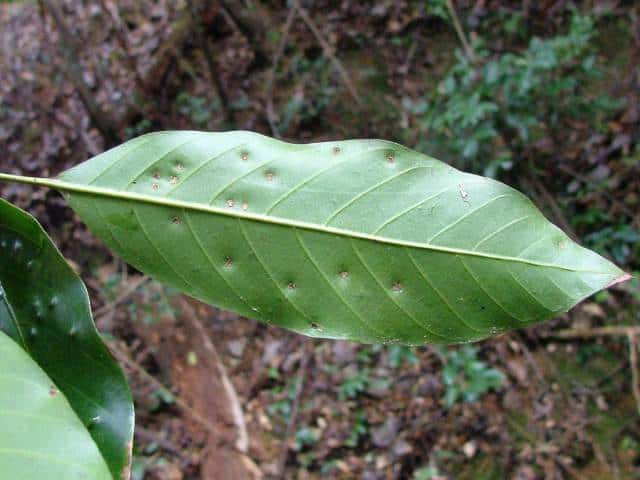 | ▼葉身は長さ約14cm、葉柄は長さ約2cm。 | ▼葉の裏面は緑色、無毛、先端は尖る。 | |