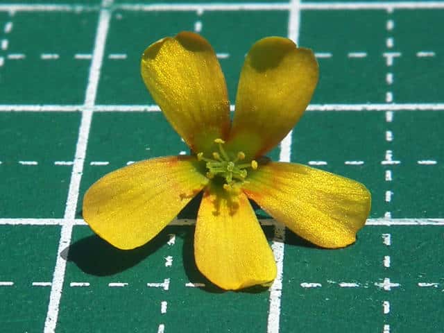 | 多年草 カタバミの1品種。日本各地の道端などの乾燥した場所に生える。茎はよく枝分かれし、下部は地面をはい、上部は立ち上がる。葉は3小葉で赤紫色を帯びる。葉の脇から散形花序を出し、径8mmぐらいの黄色の花をつける。中心部が赤くなることが多い。果実はさく果、長さ約2cmの円柱形で熟すと多数の種子をはじきとばす。種子は淡褐色、長さ約1.5mmの広卵形で、表面に横みぞが7本ある。花期は5〜9月 学名は、Oxalis corniculata f. rubrifolia カタバミ科カタバミ属 葉が緑色のものはカタバミ、また中間の色合いのものをウスアカカタバミという。 葉の表面や茎にも毛が多いものをケカタバミという。 |