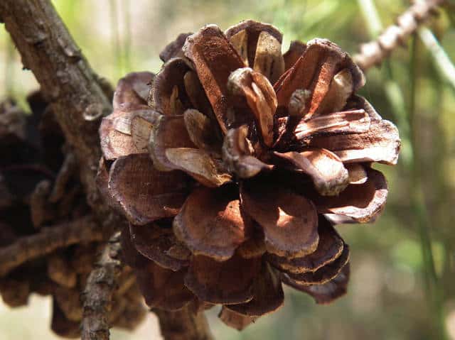 | ▼雌花はシュートの先端につく。 | ▼昨年開花した球果 | |