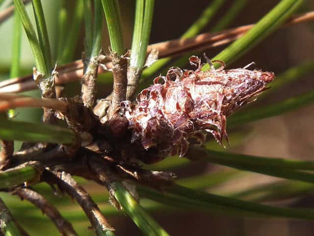 | ▼2015年5月2日 雌花 美保関 | ▼雌花はシュートの頂部につく。 | ▼シュートの基部に去年の球果がついている。 |