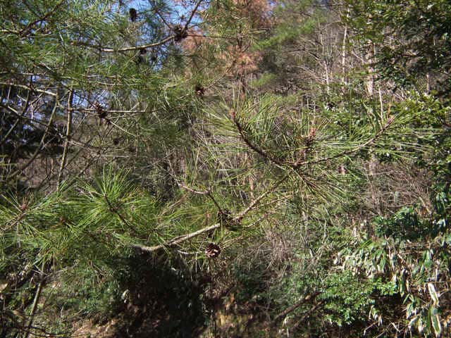 | 常緑高木 北海道南部〜九州のブナ帯以下の山地に生える。尾根筋や岩山など、土壌のやせたところや乾燥地にもよく育成する。高さ25m、直径1.2mほどになる。若いうちは円錐形、老木になると上部が扁平になり、独特な樹形となる。枯れ枝の基部は幹に残り、ヤニ分がたまって長く樹上にとどまる。樹皮は赤褐色。老木では赤味がかった灰色で、深い割れ目が生じる。新しい枝は黄褐色。葉は2葉性。長さ7〜12cm、横断面は半円形で幅0.7〜1.2mm。雌雄同株。新枝の基部に淡黄色の雄花が多数つき、先端に雌花が2〜3個つく。球果は長さ4〜5cmの卵形。種鱗はくさび形、露出部は菱形状。翌年の秋に熟すと、種鱗が開いて種子を散らす。種子は長さ4〜5mmで灰褐色。長さ1〜1.5cmの翼がある。花期は4〜5月。 冬芽はヤニに包まれ、鱗片は赤褐色。(樹に咲く花) 学名は、Pinus densiflora マツ科マツ属 仲間にクロマツがあり、葉を握ると痛い。 |