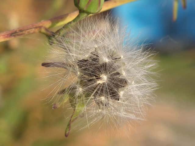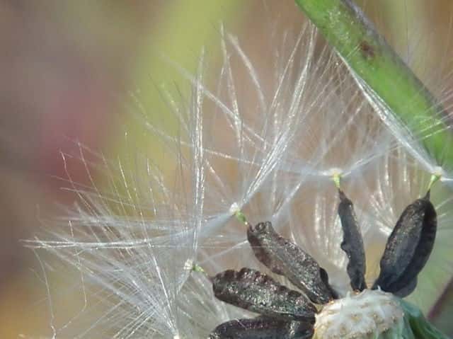 | ▼冠毛が広がると直径約2cm。 | ▼冠毛は長さ約7mm、果実は長さ約5mm。 | ▼果実は扁平で、冠毛との間に嘴がある。 |