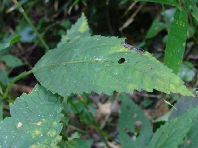 | ▼脈上に縮れた毛があり、葉面に毛がある。 | ▼葉の裏面。 | ▼脈上に短毛がある。 |