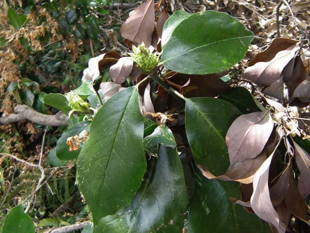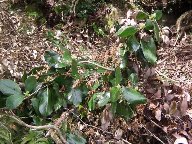 | 常緑低木 アオキ(広義)の変種で東北〜四国東部に分布。鋸歯の先は外側を向いて鋭い。 谷間の林下で多湿な環境に生えた太い枝から下垂する枝の節から気根を出すものがある。(概略)(コクサギとアオキの気根の発生と無性繁殖) 学名は、Aucuba japonica var. japonica アオキ科アオキ属 「葉緑体DNA多型からみる日本列島広域分布種の分布変遷 大井 哲雄」(2004)によると 『基準変種であるvar. japonicaアオキ(狭義)は、岩手県を北限に東北〜四国東部の太平洋側に分布し、染色体数が2n=32の4倍体です。中国・四国地方以西の西日本〜沖縄には、外部形態ではアオキに類似しますが、染色体数が2n=16で2倍体であることから区別される var. ovoideaナンゴクアオキが分布します。そして北海道西南部から日本海側の多雪地域には、4倍体で、植物体が小さく、枝が匍匐し、若い枝や葉に短毛が生える点で区別されるvar. borealisヒメアオキが分布します。』とある。 見分け方:人と自然の博物館 分布の論文:アオキ(アオキ科)の細胞地理学的研究 改訂新版日本の野生植物には、「形態的には4倍体と差異はないため、ナンゴクアオキは区別できない。」とある。 アオキとナンゴクアオキの葉の比較 松江市内の分布地図 [アオキ(広義)] 北海道南部〜沖縄の照葉樹林内に多いが、明るい雑木林や植林地にも生える。上部でよく枝分かれし、高さ2〜3m、直径6cmほどになる。樹皮は緑色で灰褐色の細い溝があり、横長の皮目がある。老木は灰褐色で、縦に細かく裂ける。若い枝は緑色で無毛。光沢がある。葉は対生。枝の上部に集まってつく。葉身は長さ8〜25cm、幅2〜12cmの卵状長楕円形。先端はとがり、基部は広いくさび形、縁の上半部に粗い鋸歯がある。質は厚く、表面は深緑色で光沢がある。両面とも無毛。乾くと黒くなる。葉柄は長さ1〜6cmで無毛。上面に浅い溝がある。雌雄別株。前年枝の枝先に円錐花序をだし、紫褐色の小さな花を多数つける。雌雄とも花は直径約1cm。花弁は4個。長卵形で先端は鋭くとがる。雄花には雄しべが4個あり、葯は淡黄色。雌花は中央に花柱があり、雄しべはない。萼筒は長卵形で、先端に萼歯が4個ある。果実は核果。長さ1.5〜2cmの長楕円形または卵状長楕円形で12月〜5月に赤く熟す。表面は光沢があり、中に核が1個入っている。核は長さ1.3〜1.5cm、幅7〜8mmの長楕円形。中央に溝がある。果実が枝についている期間が長く、しばしば花と果実がいっしょに見られる。花期は3〜4月。 冬芽は長さ2cmほどの紡錘形。緑色で、先きの尖った芽鱗が3対あり、基部の1対は短い。葉痕は三角形状の半円形、維管束痕は3個。(樹に咲く花) 学名は、Aucuba japonica |