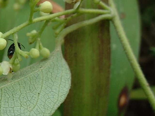 | 落葉つる性木本 北海道、関東地方以西〜沖縄の低地の草原や道端、林縁などに生える。枝は淡黄褐色の毛が生える。つるは右巻き。葉は互生。葉身は長さ3〜12cm、幅2〜10cmの広卵形〜卵心形。葉の形は変化が多く、ときに浅く3裂する。縁は全縁。両面とも淡黄褐色の毛がある。葉柄は長さ1〜3cm。雌雄別株。枝先と葉腋に小さな花序をだし、黄白色の花をつける。花弁と萼片は6個。雄花の雄しべは6個。雌花には雌しべ6個と仮雄しべが6個ある。花弁の先は2裂する。果実は核果。直径6〜7mmの球形で、10〜11月に粉白を帯びた黒色に熟す。核は直径約5mm。中心がへこんで、まるまった芋虫のような形をしている。外面には横方向に、やや細かいしわがある。別名カミエビ 花期は7〜8月。(樹に咲く花) 子房が6個の心皮に分かれ、花後に心皮が離れ、各々が1個の果実になる。 学名は、Cocculus trilobus ツヅラフジ科アオツヅラフジ属 似たものにツヅラフジがあるが、葉柄が長く、茎や葉が無毛。 |