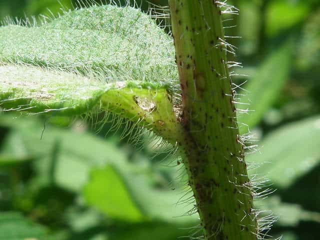 | ▼脈上や葉面にも毛が多い。 | ▼毛の基部が赤褐色に膨れている。 | |