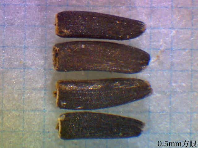 | ▼鱗片先端部の毛。 | ▼果実は長さ2〜2.2mm。 | ▼果実の先端部、4稜形。 |