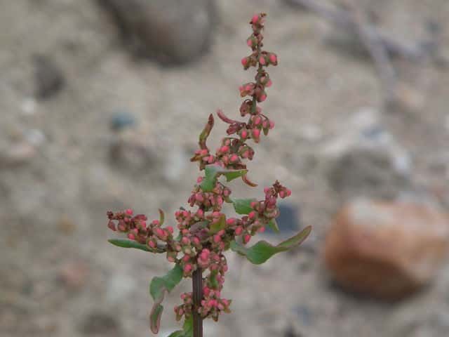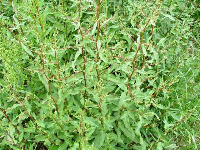 | 多年草 ヨーロッパ原産。明治時代に渡来し、本州中部にふつうに見られる。道ばたや川岸、鉄道沿いなどに生え、高さ0.4〜1.2mになる。ほかのギシギシ類に比べてほっそりしている。葉は長さ10〜20cmの長楕円形〜披針形で、基部は円形〜浅い心形。ふちは細かく波打つ。花は間隔をおいて輪生状につくので、花序はまばらに見える。花のあと内花被片は翼状になり、中央部のこぶ状の突起が大きく、よく目立つ。花期は6〜10月。(野に咲く花) 学名は、Rumex conglomeratus タデ科ギシギシ属 似たものの比較。 |