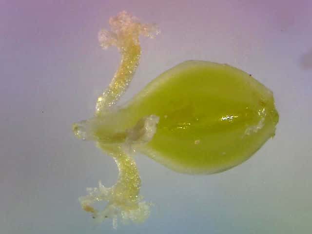 | ▼3個の柱頭をつけた子房。 | ▼子房は長さ約0.7mm、3稜形。 | |