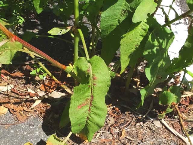 | ▼上部の葉(上)〜下部の葉(下) | ▼下部の葉の葉身は長さ約16cm、基部は浅い心形。 | |
