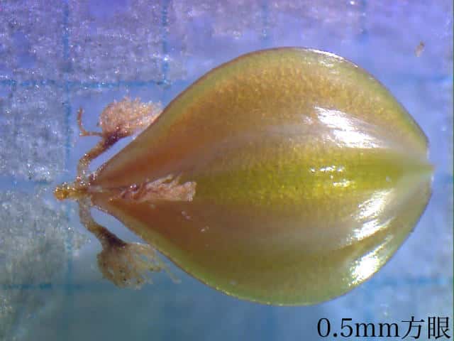 | 2012年6月25日 果実 玉湯 | ▼内花被片は長さ約2.5mm、粒体は約1.4mm。 | ▼3個の粒体は、ほぼ同大。 |