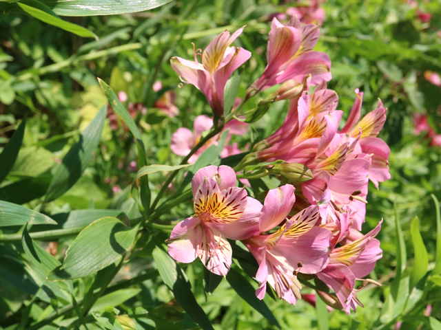 | 多年草 南米原産。塊根がある。葉は互生し、槍のような形。葉柄が捻じれ、葉表が下に向き、葉裏が上に向き光沢がある。花は散形花序につく。花は黄色~ピンク、内花被片3個、外花被片3個。内花被片に褐色の班点があり、外花被片は幅が広い。雄しべ6個。子房下位。花期は6〜7月。(三河の植物観察) 同属の花にユリズイセン(Alstroemeria pulchella=Alstroemeria psittacina)があるが、花が筒状で全ての花被片の内側に、褐色の斑点が多数つく。 学名は、Alstroemeria aurea ユリズイセン科ユリズイセン属 |