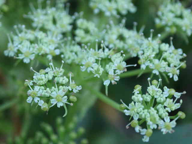 多年草 関東地方南部、東海地方、紀伊半島、伊豆諸島・小笠原の海岸に生える。茎は太くて、上部はよく枝を分け、高さ50〜120cmになる。葉は1〜2回3出羽状腹葉をなし、小葉は広卵形で、粗い鋸歯がある。葉柄の下部または全部が淡色で、袋状にふくらむ。茎や葉に濃い黄色の汁液を含む。複散形花序は総苞片がなく、小総苞片は数個ある。淡黄色の花をつけ、萼歯片はない。果実は長楕円形、分果の両翼はそれほど広くない。油管は各背溝下に1個、合生面に4個ある。分果の翼状の部分はハマウドほど広くない。花期は8〜10月。(日本の野生植物) 学名は、Angelica keiskei セリ科シシウド属 |
