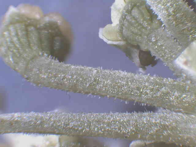 | ▼葉の表面。 | ▼葉脈状に小さな突起毛がある。 | ▼葉の裏面、白味を帯びる。 |