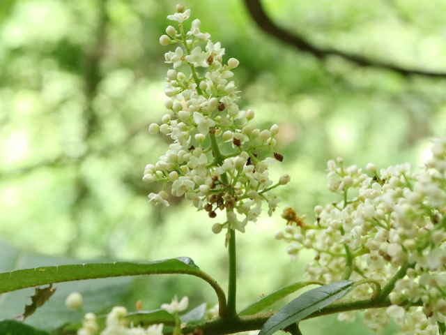 | 落葉高木。 本州〜九州の丘陵の雑木林から山地の林内に生える。高さ12m、直径30cmほどになる。樹皮は灰褐色。小さな楕円形の褐色の皮目がある。若い枝は細く、褐色の伏毛がある。葉は互生。枝先に集まってつく。葉身は長さ8〜25cm、幅4〜8cmの長楕円形または倒卵状長楕円形。先は鋭くとがり、基部は広いくさび形。ふちには先端が芒になる小さな鋸歯がある。質は薄い。側脈は20〜28対、ほぼ平行に並び、裏面に突出する。表面は脈上を除いて無毛。裏面は全体に淡褐色の毛が生え、脈上には密生する。葉柄は長さ1〜2cm、褐色の斜上する毛が密生し、上面に溝がある。本年枝の先に長さ15〜25cmの大きな円錐花序をだし、小さな淡黄白色の花を多数つける。花序には毛が密生する。花は直径約3mmほどで、芳香がある。花弁は5個、外側の3個は大きく広卵形、内側の2個は小さく線形。雄しべは5個、1〜2個が完全雄しべで、残りは退化して仮雄しべになっている。完全雄しべは花糸の先端が杯状に広がって葯がつく。仮雄しべは鱗片状で白く、花柱の下半部を包む。果実は核果。直径4〜5mmの球形、9〜10月に赤く熟す。花は花序にびっしりとつくが、果実はまばら。核は褐色でかたい。中に種子が1個入っている。花期は6〜7月。 冬芽は裸芽。褐色の伏毛におおわれる。頂芽は細長く長さ1cmほど。側芽は小さい。葉痕は縦長の半円形。維管束痕は小さく、8個ほどが半円形に並ぶ。(樹に咲く花) 学名は、Meliosma myriantha アワブキ科アワブキ属 参考 アワブキの花の構造 |