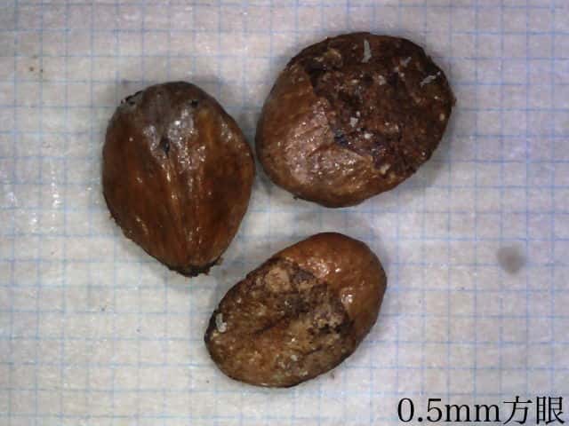 | ▼種子は3個入り、長さ4〜4.5mm。 | ▼去年の果実の種子。 | |