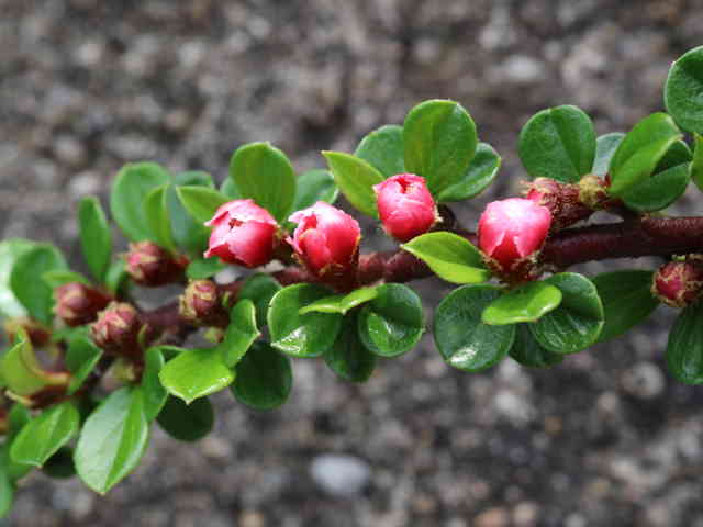 | 半常緑低木 中国原産。枝は横に広がり、刺はない。葉は長さ5〜15mmの倒卵形で、厚くて光沢がある。花は直径約6mm、白色または紅色を帯びる。果実は直径5mmほどの球形で、秋に紅色に熟す。花期は5〜6月。(樹に咲く花) 学名は、 Cotoneaster horizontalis バラ科シャリントウ属 ベニシタンの花弁は平開せず、開花してもかろうじて虫が出入りできるくらいなので実と間違うひともいます。(盆栽びより) |