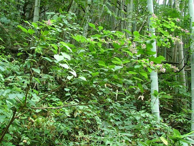 | 落葉半低木 富山県・静岡県以西〜九州の日当たりのよい山地にふつうに見られる。高さ1.5mに達する。頂小葉の葉身は楕円形〜長楕円形、ふつう鋭頭あるいはやや鈍頭、長さ2〜6cm、向軸側表面有毛。花は紅紫色で、長さ12〜17mm。萼は4裂し、萼裂片は狭卵形、鋭頭、筒部よりやや長く、背軸側裂片は他より少し長い。小苞は狭卵形、節果は楕円形、長さ6〜8mm、幅約3mm。別名ニシキハギ。花期は8〜10月。(日本の野生植物) 学名は、Lespedeza thunbergii subsp. thunbergii f. angustifolia マメ科ハギ属 ニシキハギはビッチュウヤマハギと同種とされることもあるが、ニシキハギは野生種であるビッチュウヤマハギが栽培されている間に他の種と交雑をして生じたいろいろな型の雑種の集合と考えられる。ハギ属の分類(東京大学総合研究博物館) |