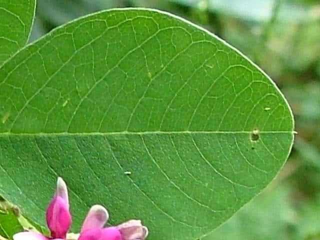 | ▼翼弁は竜骨弁より短く、色が濃い。 | ▼萼裂片は細く伸びる。上唇は浅く2裂。 | ▼下から。 |
