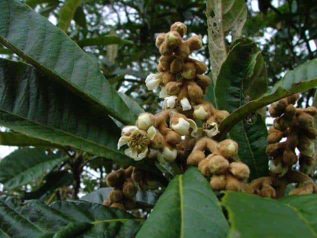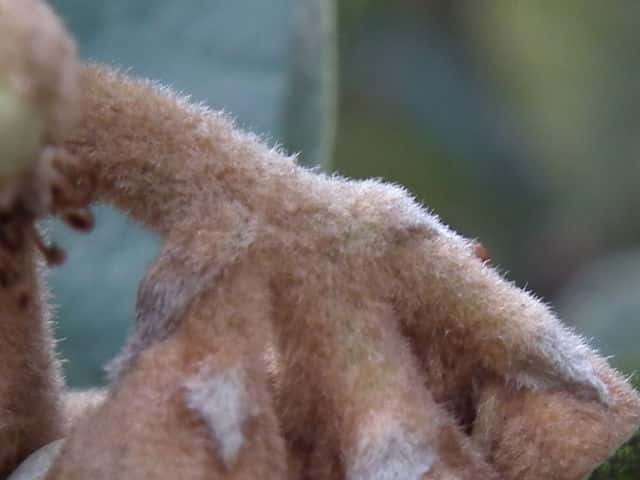| 常緑高木 中国から渡来したといわれているが、野生も確認されている。原産説についてはいろいろ議論があるが、奈良時代に記述があり古くから日本にあったのは間違いない。暖地で果樹として栽培されている。高さ6〜10mになる。樹皮は灰褐色。横じわがある。若い枝には褐色の綿毛が密生する。葉は互生。葉身は長さ15〜20cmの広倒披針形〜狭倒卵形。先端はとがり、基部はしだいに狭くなって葉柄に続く。表面は無毛で光沢があり、ふつう縁の上半部に粗い鋸歯がある。裏面には褐色の綿毛が密生する。長さ10〜20cmの円錐花序に芳香のある小さな花が100個前後つく。花は直径約1cm、花弁は白色で5個ある。花弁の内側の下部、萼、花序には褐色の綿毛が密生する。果実はナシ状果。直径3〜4cmの広楕円形で、5〜6月頃に黄橙色に熟す。果実ははじめ綿毛があるが、のちに無毛。果実の頂部には内側に曲がった萼片が残る。種子は長さ2〜3cm。なかには白い肉質の子葉が入っている。花期は11〜1月。 冬芽は、褐色の綿毛におおわれる。(樹に咲く花) 学名は、Eriobotrya japonica バラ科ビワ属 |