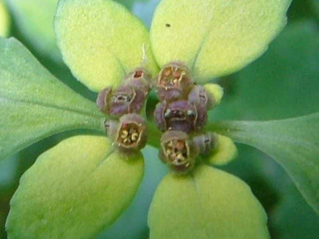 | ▼縦の溝に棒状突起が壁のように並んでいる。 | ▼果実がまだ裂開していない株。 | |