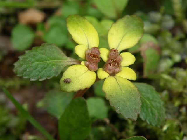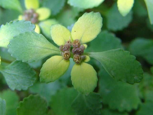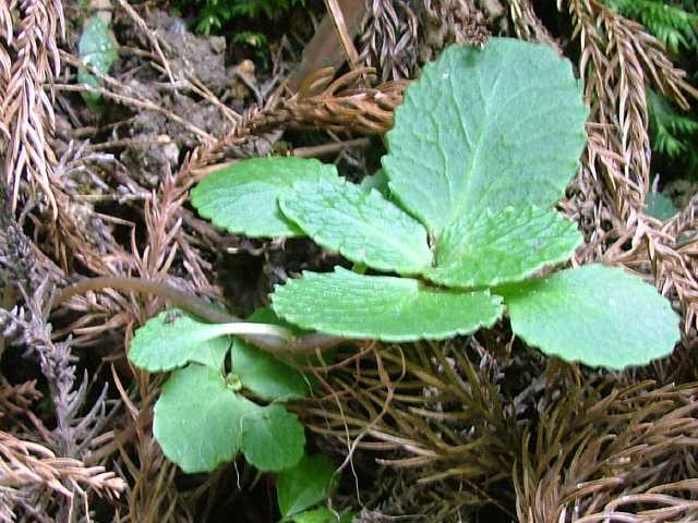 | 多年草 本州(岐阜県以西の日本海側)の谷間の湿地に生える。根出葉は花時に生存し、ほぼ円形で短い葉柄があり、幅15〜30mm、脈は白く目立つ。花茎は直立し高さ5〜25cm、通常紅色を帯びほとんど毛はない。苞葉は卵形〜長楕円形、長さ1〜2cm、幅5〜10mm、花時には一部黄色となる。萼裂片4個は直立して暗赤褐色。雄しべは8個では萼片より短く、葯は暗紅紫色。種子は肋上に丸い突起が互いに接して並ぶ。別名ボタンネコノメ。花期は4〜5月。(原色日本植物図鑑) 学名は、Chrysosplenium kiotoense ユキノシタ科ネコノメソウ属 よく似たホクリクネコノメは萼裂片が淡緑色、葯が暗紅紫色、雄しべが萼裂片より長い。 |