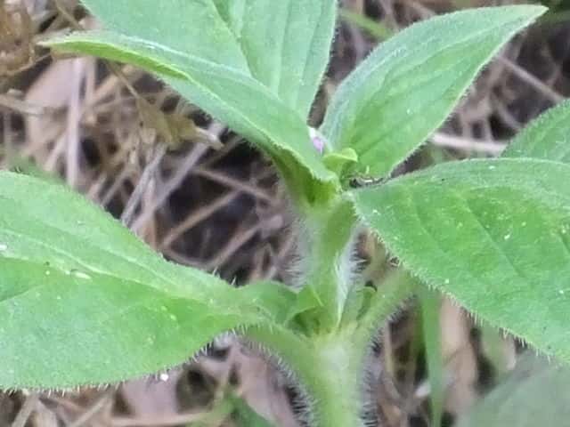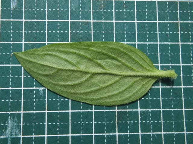 | ▼葉は対生し、茎には毛が密生する | ▼葉身は長さ約6.5cm。短い葉柄がある。 | ▼両面とも短毛が密生する。 |