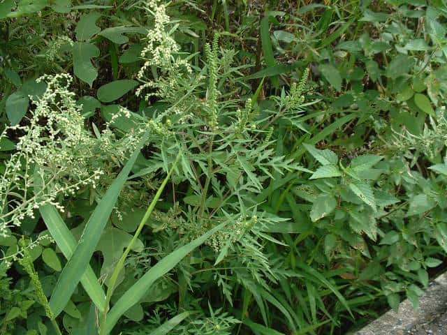 | 1年草 北アメリカ原産。明治初期に渡来したが、定着したのは昭和になってから。現在では各地で雑草化し、夏から秋にかけての花粉症の原因のひとつになっている。茎にはふつう軟毛があり、高さ0.3〜1mになる。葉はやわらかく、下部では対生、上部では互生し、2回羽状に深裂する。雄頭花は直径3〜4mmで、細長い総状花序につく。雌頭花は雄花序の基部の葉腋に2〜3個集まるが、ほとんど目立たない。雌頭花の総苞は果期には長さ3〜5mmになり、先端はとがり、そのまわりを約6個の小突起が囲んでいる。花期は7〜10月。(野に咲く花) 学名は、Ambrosia artemisiifolia キク科ブタクサ属 「中国植物物種信息数据庫」に「痩果倒卵形、無毛、藏於堅硬的総苞中。」とある。 似た仲間に葉が掌状に裂けるオオブタクサがある。ブタクサの雌頭花は、総苞に包まれた雌しべのみの1小花からなる。 |