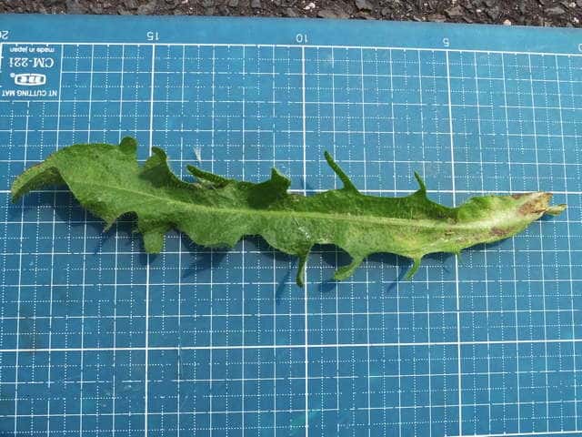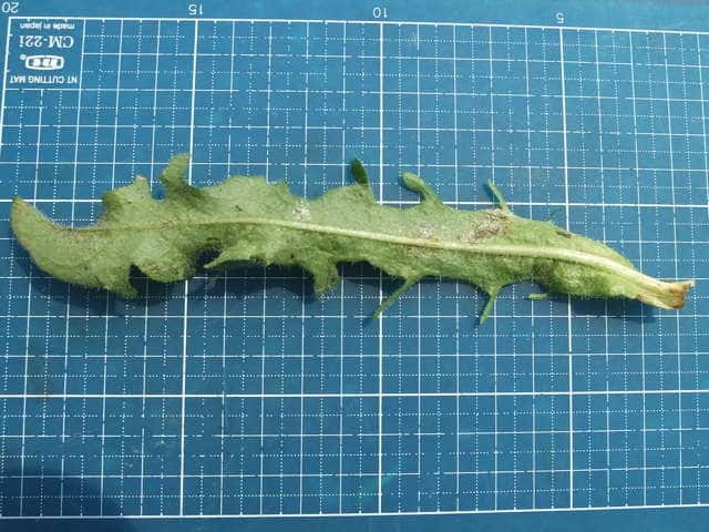 | ▼花茎の下部には小さな葉があった。 | ▼葉は根生する。 | ▼根生葉は長さ約18cm。波形の鋸歯がある。 |