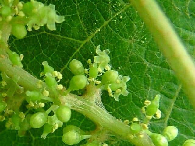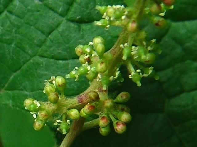 | 落葉つる性木本 本州〜沖縄の丘陵から山地の林内や林縁に生える。巻ひげで他物にからみつく。本年枝は細く、はじめクモ毛がある。葉は互生。葉身は長さ幅ともに5〜8cmの卵形〜広卵状三角形。ふつう3〜5裂するが、切れ込み方は変化が多い。縁には浅い鋸歯がある。基部は深いハート形。表面ははじめクモ毛があるが、後に無毛。裏面は淡褐色または白色のクモ毛に覆われ、秋まで残る。葉柄は長さ2.5〜8cm。雌雄別株。葉と対生して長さ6〜12cmの円錐花序を出し、黄緑色の小さな花をつける。花弁は開花と同時に落ちる。両性花の花序は雄花序より小形で花はまばらにつく。雄花の雄しべは長く、両性花の雄しべは短い。果実は液果。直径約6mmほどの球形で、黒く熟す。種子は暗赤褐色で長さ4mmほど。花期は6〜8月。(樹に咲く花) 学名は、Vitis ficifolia ブドウ科ブドウ属 葉の切れ込みの深いものをキクバエビヅル(Vitis ficifolia f. sinuata)といい、西日本に多い。 |