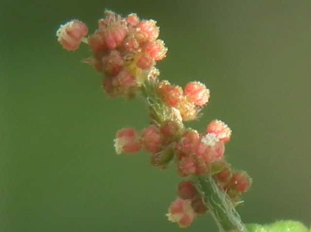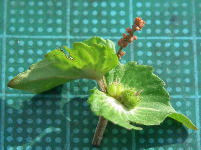 | ▼雄花穂の上に雌花がついている。 | ▼果実は直径約3mm、中心に花柱が残る。 | ▼種子は長さ約1.5mmで、3個入る。 |
