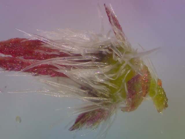 | ▼まだ花柱が伸びていない雌花(上)。 | ▼子房は3個の花被に包まれている。 | ▼花被を1個ずらすと子房が見える。 |