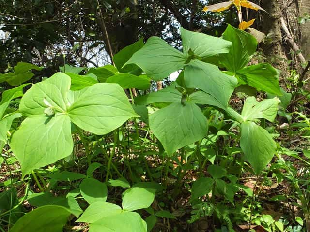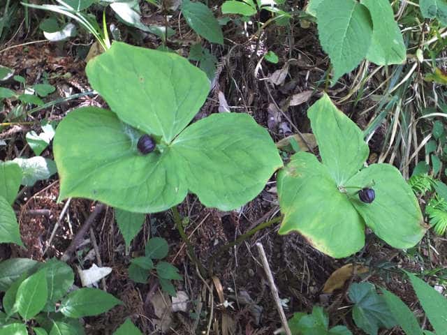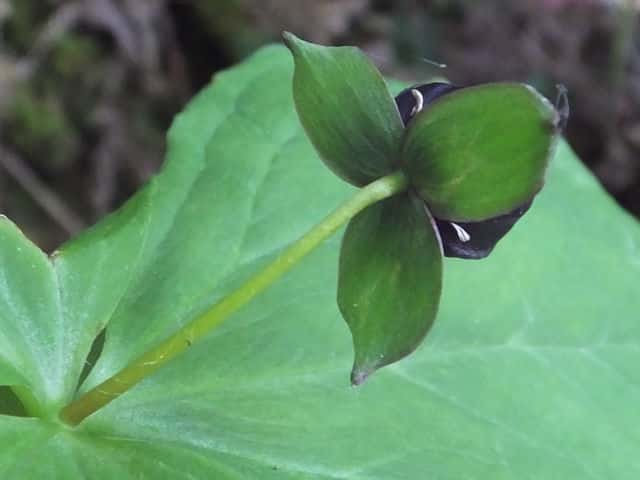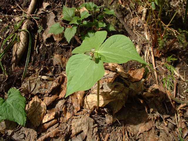 | 多年草 北海道〜九州の山地の林内のやや湿ったところに生える。茎は高さ20〜40cm、葉は卵状菱形で長さも幅も6〜17cm、先は急に短くとがり、基部は広いくさび形。花は茎頂に1個、やや横向きにつく。花柄は長さ2〜4cm、外花被片は緑色または褐紫色、卵状長楕円形で長さ12〜20mm。花後も落ちない。内花被片はふつうないが、まれにあるものもある。雄しべは6個、葯は長楕円形で花糸よりやや短い。柱頭は3裂し、ごく短い。液果は3稜のある球形で、径1〜2cm、緑色〜黒紫色。種子は湾曲した長楕円形。花期は4〜5月。(日本の野生植物) 学名は、Trillium apetalon シュロソウ科エンレイソウ属 |