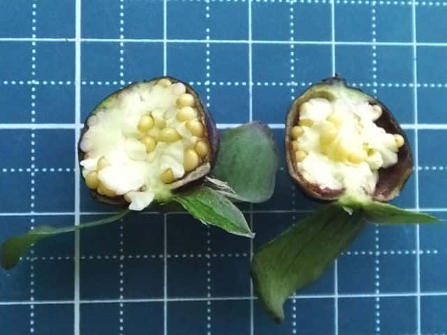 | ▼果実は直径約1.5cm。 | ▼果実の縦断面、種子が詰まっている。 | |