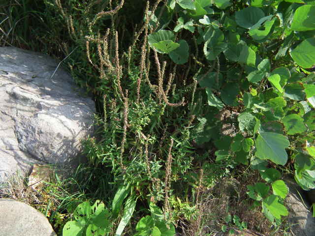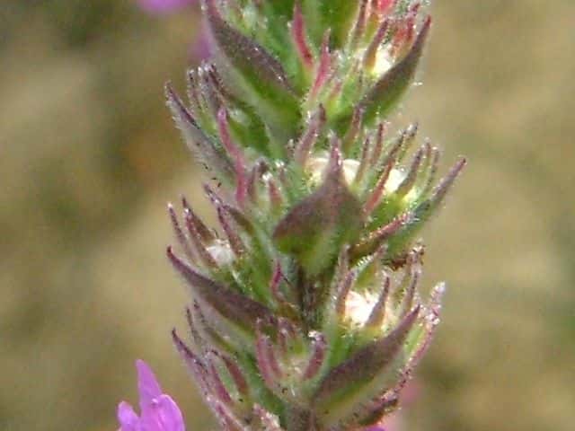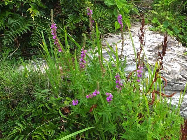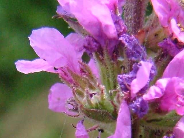 | 多年草 北海道〜九州の湿原によく群生する。根茎は横に伸びる。全体に乳頭状突起を密生するか、ときにはほとんど無毛。茎は直立し、毛の多少に変化があり、上部は枝を伸ばし、高さ50〜150cmになり、4稜か6稜ある。葉は柄がなく、対生するか3個輪生し、長披針形〜広披針形、先はふつう鋭形、基部は円形〜浅心形で、なかば茎を抱き、長さ3.5〜6.5cm、幅0.8〜1.5cm。穂状花序は頂生し、多くの花をつけ。長さ20〜35cm。萼筒は長さ4〜8mm、12肋条があり、裂片は6個、裂片間の付属片は針状で直立し、長さ1.2〜2mm。花弁は6個、紅紫色、長楕円形、長さ6〜8mm。雄蕊は12個で2輪になり、交互に長短がある。子房は2室。花柱の長さには長、中、短の3型がある。さく果は2裂開し、さらに2裂する。ミソハギに似ているが、茎や葉、花序などに短毛がある。葉はふつう対生し、基部は茎を抱く。萼に毛があり、萼片の間の付属片はミソハギは開出するのに対し、直立する。花期は7〜8月。(日本の野生植物) 全体に短毛がある。葉および苞葉は基部心形となり、うらは毛状の凸起がある。茎の上部やがくも毛状凸起が多く、付属体は直立する。(原色日本植物図鑑) 学名は、Lythrum salicaria ミソハギ科ミソハギ属 似た花にミソハギやメミソハギがある。 |