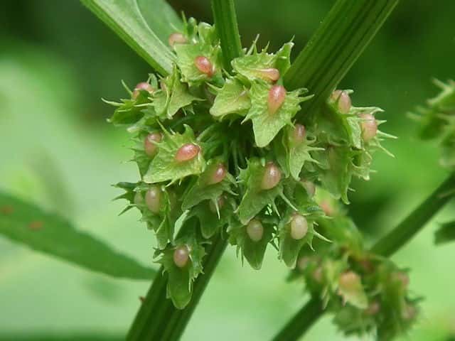 | ▼花被片の鋭い刺状の突起。 | ▼瘤体は1方だけが大きくなる。 | ▼花被片の中に1個の果実がある。 |