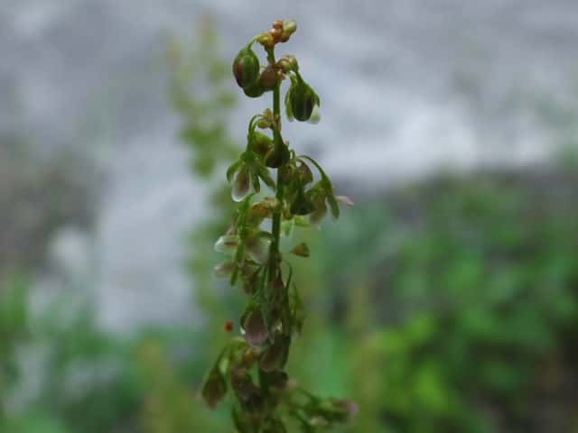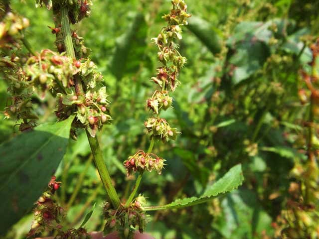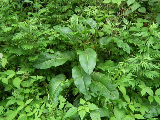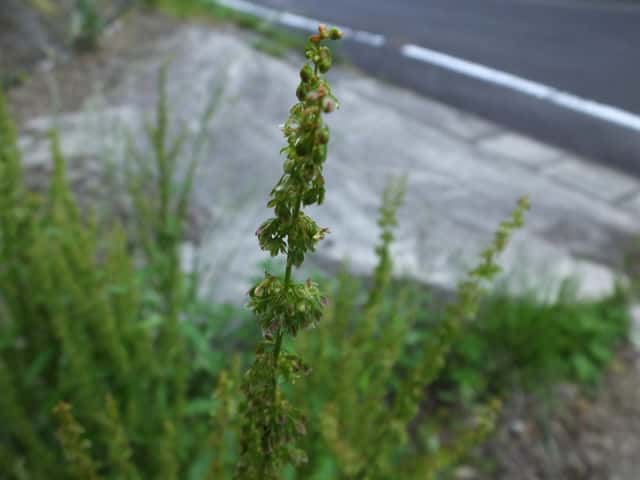 | 多年草 ヨーロッパ原産。沖縄を除く各地に帰化している。道ばたや荒れ地に生え、高さ0.5〜1.3mになる。茎や葉柄、葉の中脈がしばしば赤みを帯びる。葉は長さ15〜30cmの卵状楕円形〜長楕円形で基部は心形。裏面の脈状には毛状の突起があり、ふちは細かく波打つ。茎の上部に総状花序を多数だし、淡緑色の小さな花を輪生状につける。花のあと内花被片3個は翼状になり、下部のふちに刺状の突起がある。中央部はこぶ状にふくれ、そう果を包んでいる。花期は6〜9月。(野に咲く花) 学名は、Rumex obtusifolius タデ科ギシギシ属 似たものの比較。 |