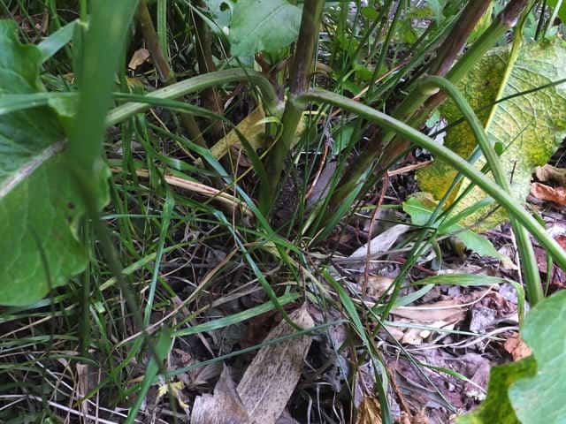 | ▼茎の最下部につく葉。 | ▼再下部の葉の葉身は長さ約30cm | ▼花期には根生葉は枯れている。 |