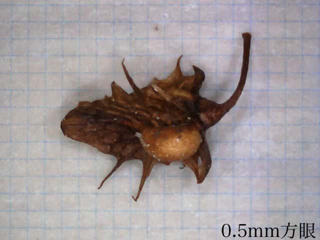 | ▼果実は3稜形で、長さ約2.6mm。 | ▼果実の頂部に柱頭が残る。 | |