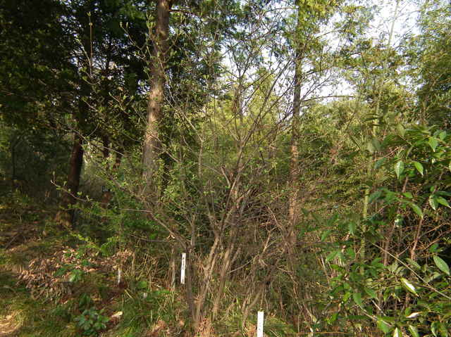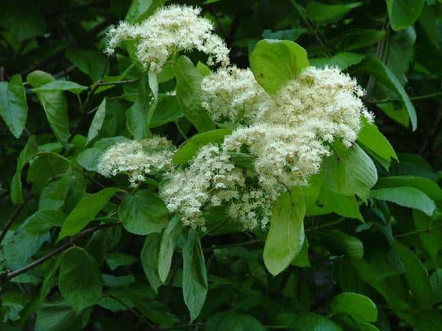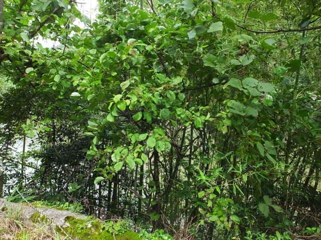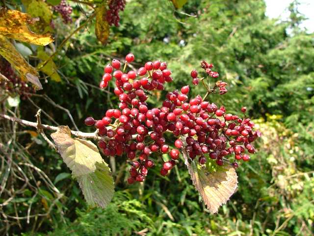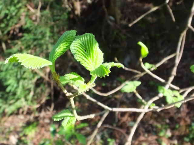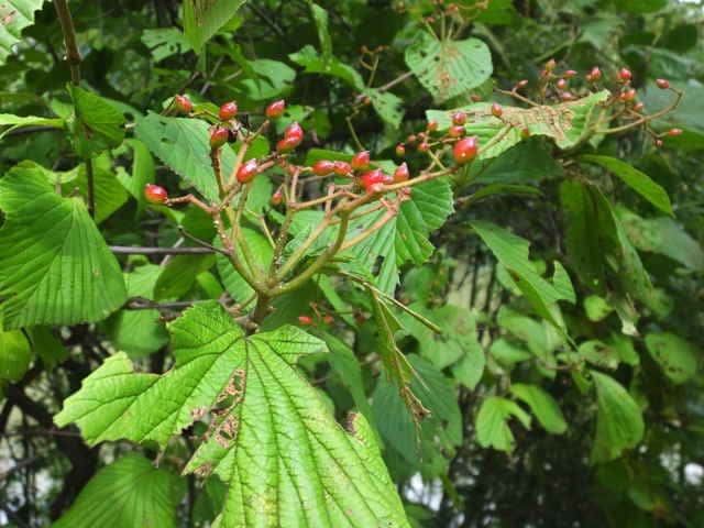 | 落葉低木 北海道西南部〜九州の丘陵〜山地に生える。高さ5mほどになる。樹皮は灰褐色。若い枝は灰緑色で、開出毛と小さい星状毛がある。葉は対生。葉身は長さ6〜14cm、幅3〜13cmの倒卵形や卵形から円形。ふちには浅い鋸歯がある。両面とも毛があり、とくに脈上に多い。裏面には全面に細かい腺点があり、葉身の基部付近には大きい腺点が2〜3個ある。葉柄は長さ1〜2.5cmで、毛が多い。托葉はない。枝先の直径6〜10cmの散房花序をだし、白い小さい花を多数つける。花序の軸には開出毛や星状毛が密生する。花冠は直径5〜8mm、5深裂して平開する。果実は核果。長さ6〜8mmの広卵形。9〜11月に赤く熟す。核は長さ5〜6mm。花期は5〜6月。 冬芽は、長さ3〜5mmの卵形。芽鱗は2対あり、外側の1対は小さい。(樹に咲く花) 学名は、Viburnum dilatatum ガマズミ科ガマズミ属 |
