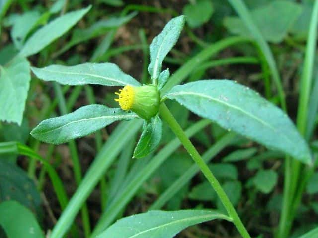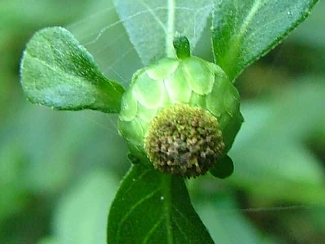 | ▼頭花の基部に苞が4個ある。 | ▼頭花の下部は直径約7mm、長さ7mm。 | ▼雌花(上)、両性花(下)。 |