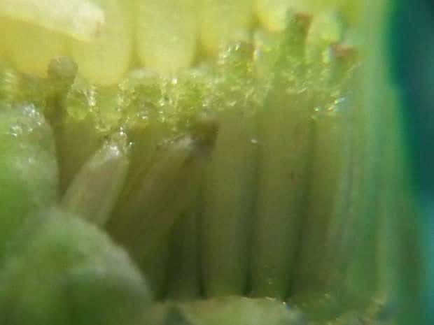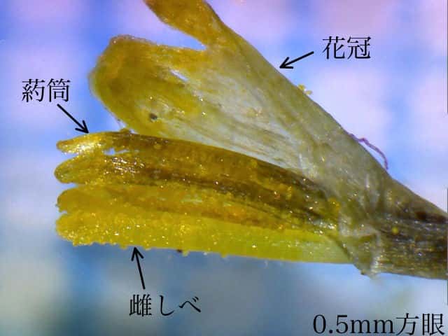 | ▼頭花は直径約7mm。 | ▼頭花を割ってみた。 | |