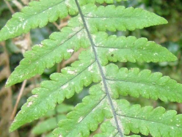 | 夏緑性シダ植物 北海道〜九州の低地の山野に生える。葉柄はわら色で毛が多く、基部に線状三角形、褐色の鱗片がつく。葉身は1回羽状複葉で、上下に向かって幅が狭まる。羽片は両面ともに毛が生え、基部は中軸に流れてつき、下側は三角状の翼となる。ソーラスは円形で中肋と辺縁の中間につき、包膜はない。 学名は、Thelypteris decursivepinnata ヒメシダ科ヒメシダ属 |