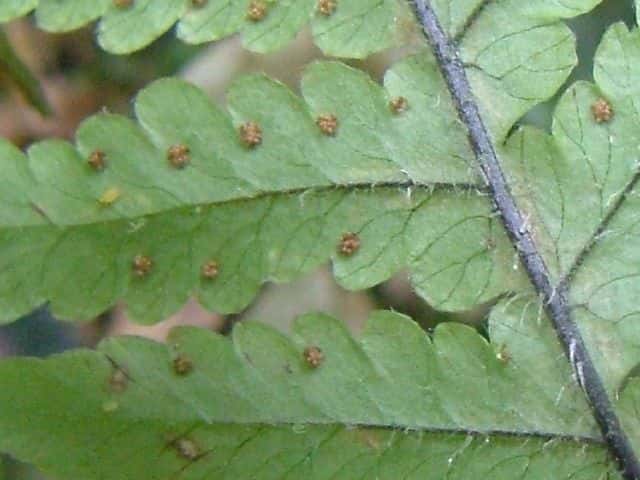 | ▼羽片基部下側は三角状の翼となる。 | ▼ソーラスは円形で、包膜はない。 | |