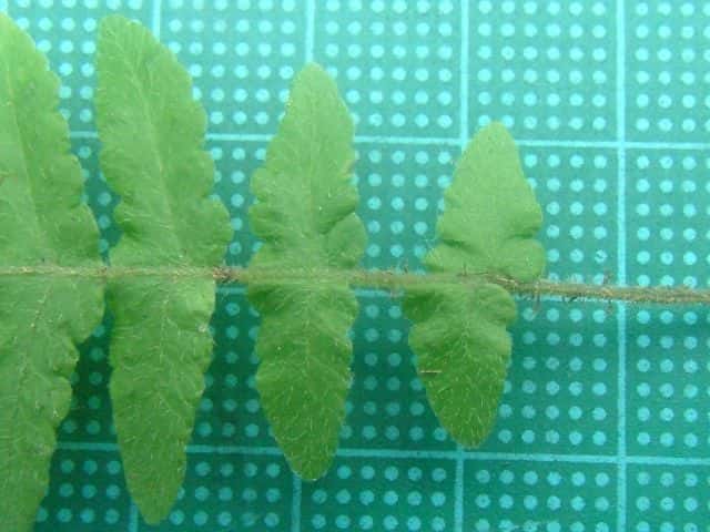 | ▼葉面に毛が多く、ソーラスには包膜はない。 | ▼羽片表面の脈上の毛。 | ▼羽片裏面の脈上の毛。 |