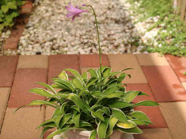 | 園芸種の小型のギボウシの仲間でオトメギボウシにも似るが、花の中心が白くなく、花茎に稜がない。また花期が遅く葉も少し大きい。 | ||